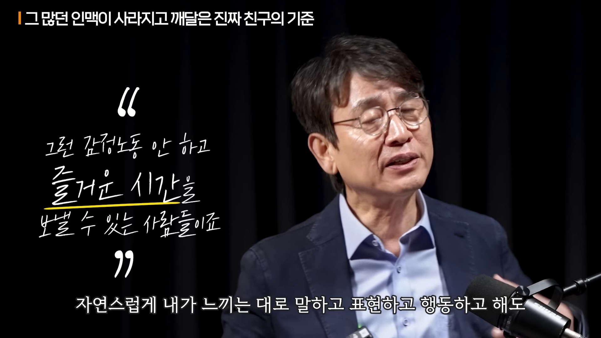방송인 한석준과의 대화에서 유시민은 “감정노동이 너무 힘들다”고 고백합니다. 젊었을 땐 견딜 수 있었던 인위적인 인간관계가 이제는 어려워졌다는 것인데요, 그는 진정으로 편안하게 말할 수 있는 사람들과만 교류하겠다고 말합니다. 이는 ‘진정성’이라는 키워드를 곱씹게 만듭니다. 지식인사이드는 이처럼 삶의 본질을 다룰 줄 아는 인터뷰입니다.